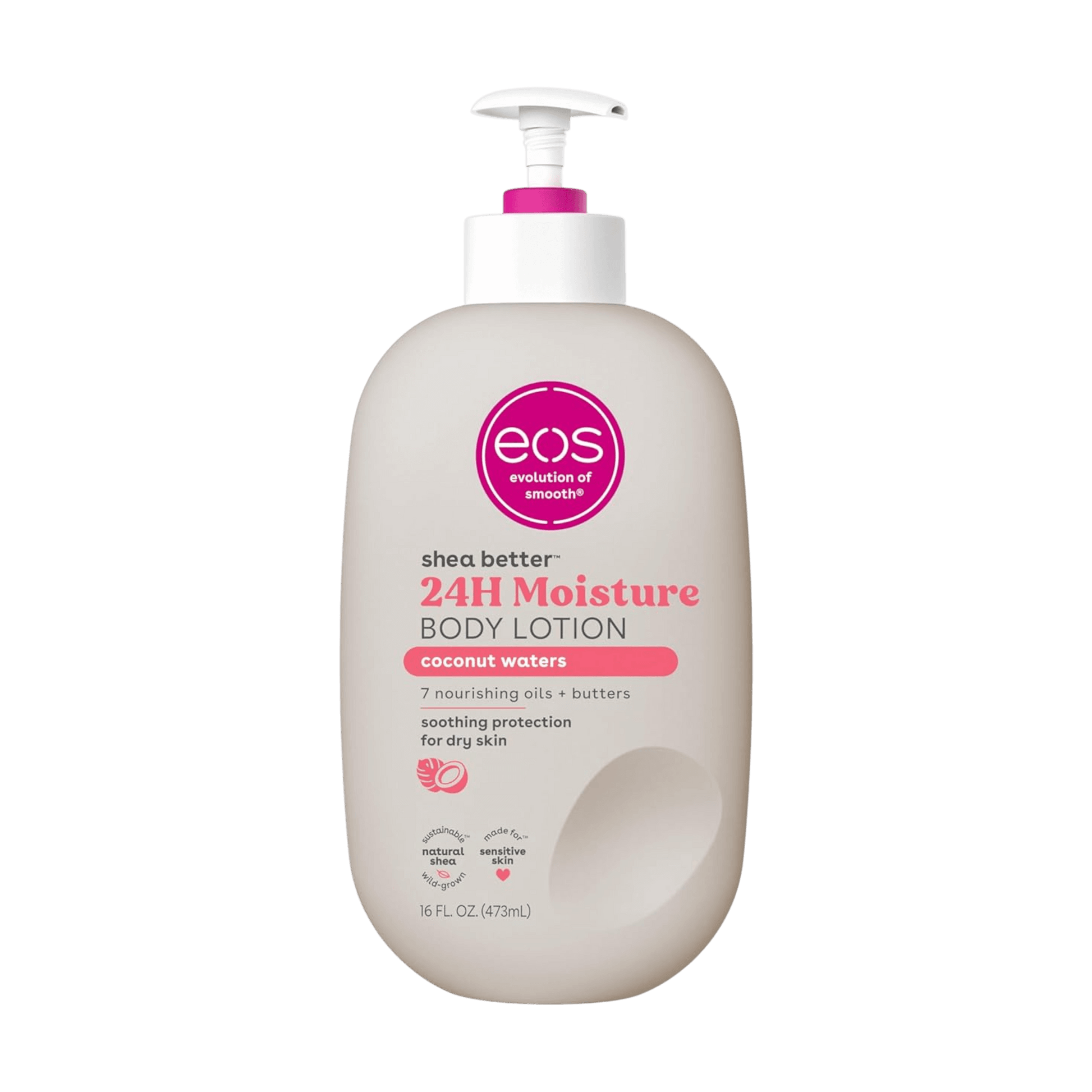 - SHEA BETTER BODY LOTION: Our warm and sun-kissed Coconut Waters scent contains fragrance notes of creamy coconut, lush hibiscus, and solar musk. eos 24-hour hydration body lotion is made with natural ingredients to leave your skin smooth from head to toe.